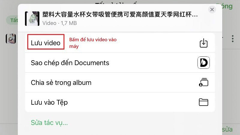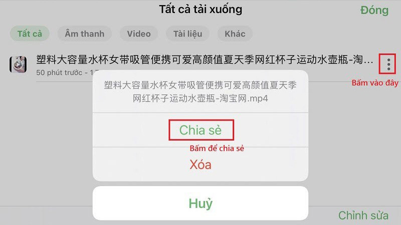 Bước 6: Chọn tiếp vào ký hiệu ba dấu gạch ngang ở góc phải màn hình, chọn tiếp “Tệp đã tải về”, chọn tiếp “Chia sẻ” và cuối cùng chọn “Lưu video”.
